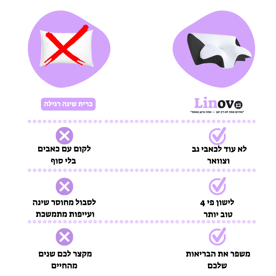 בעולם של חיקויים זולים והבטחות ריקות – אנחנו מציעים פתרון אמיתי . לכן יצרנו את Linovo הכרית שלנו מבוססת על עקרונות ארגונומיים מדויקים, עם קצף זיכרון איכותי שתומך בצורה טבעית בצוואר והראש. זה לא רק נשמע טוב – זה מרגיש נכון.